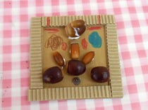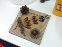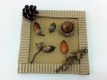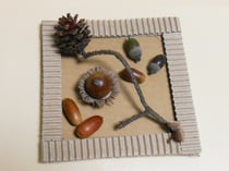 赤松先生がせっせと拾い集めてきてくれた、たくさんの種類のドングリや松ぼっくりを、段ボールのかわいい額にボンドで貼りつけます。
