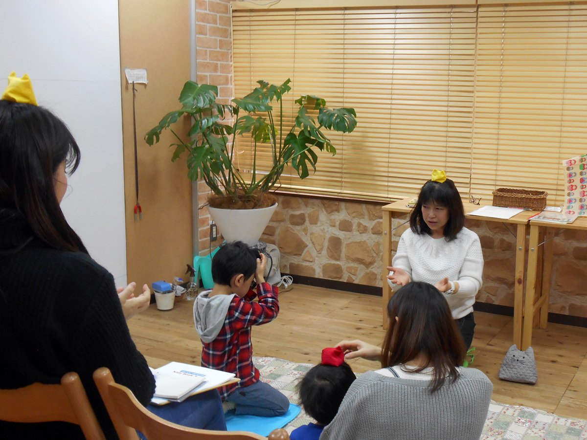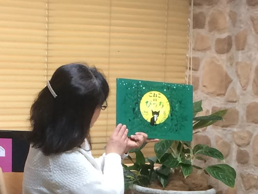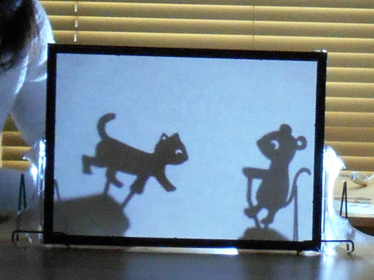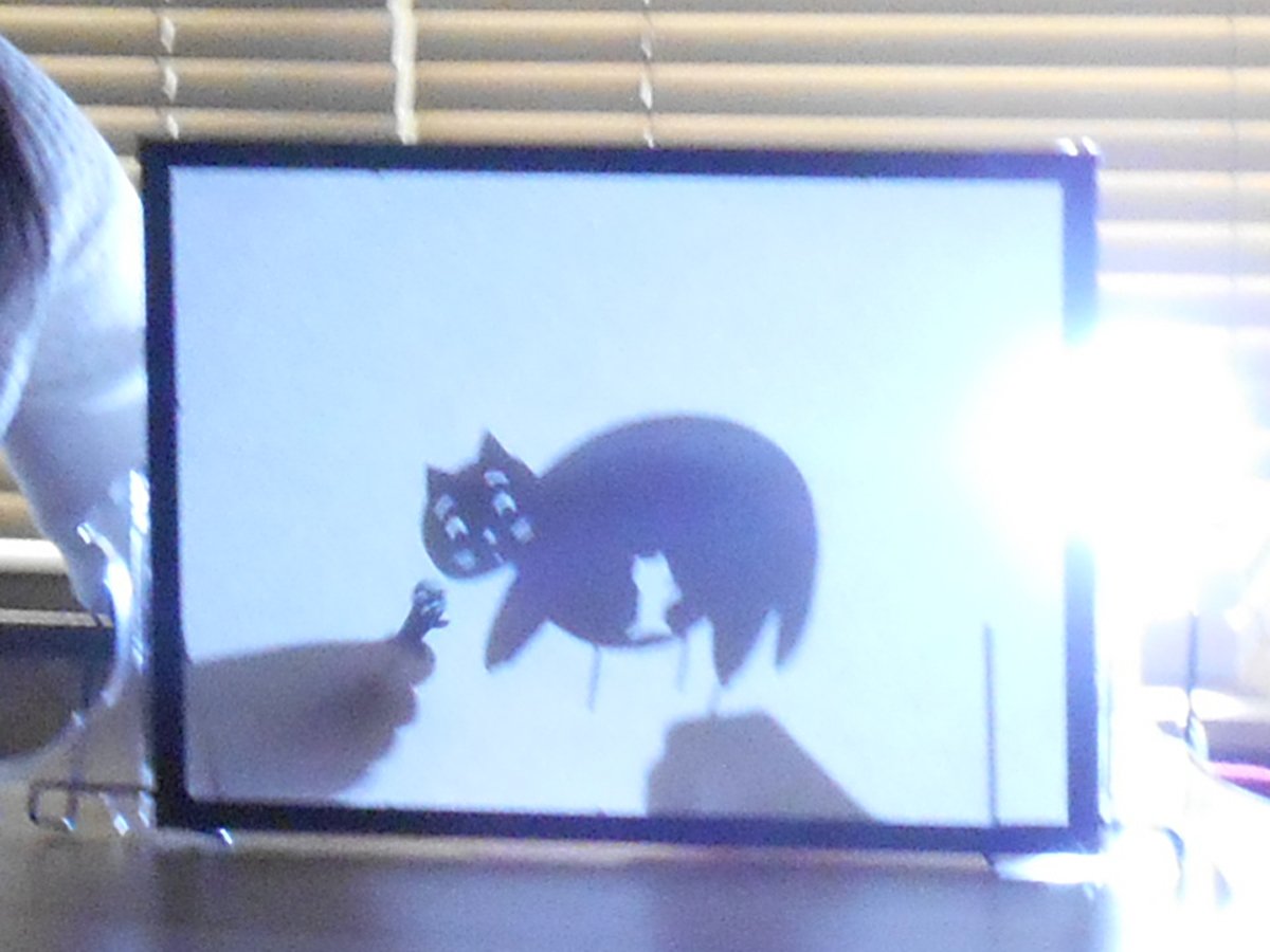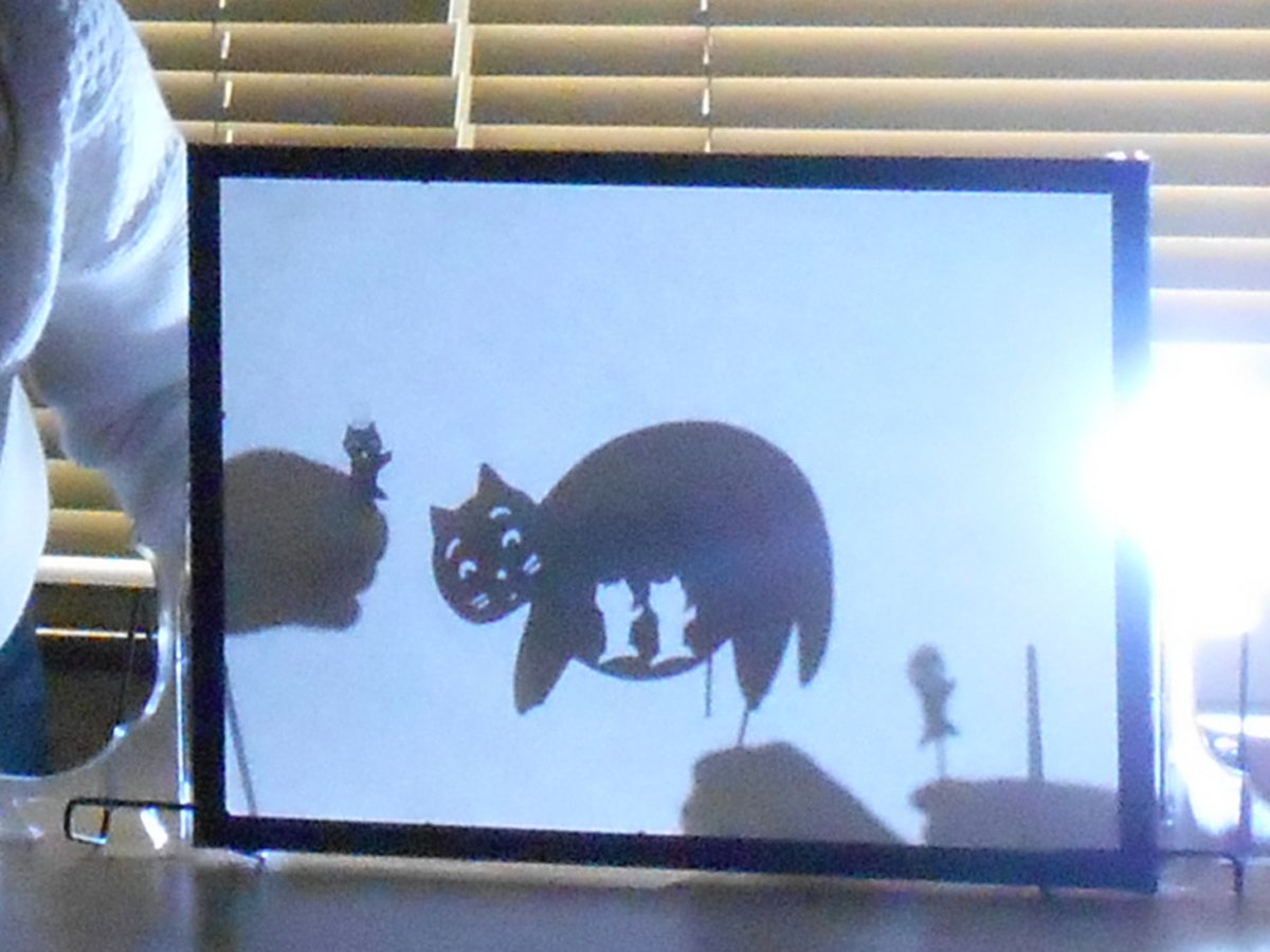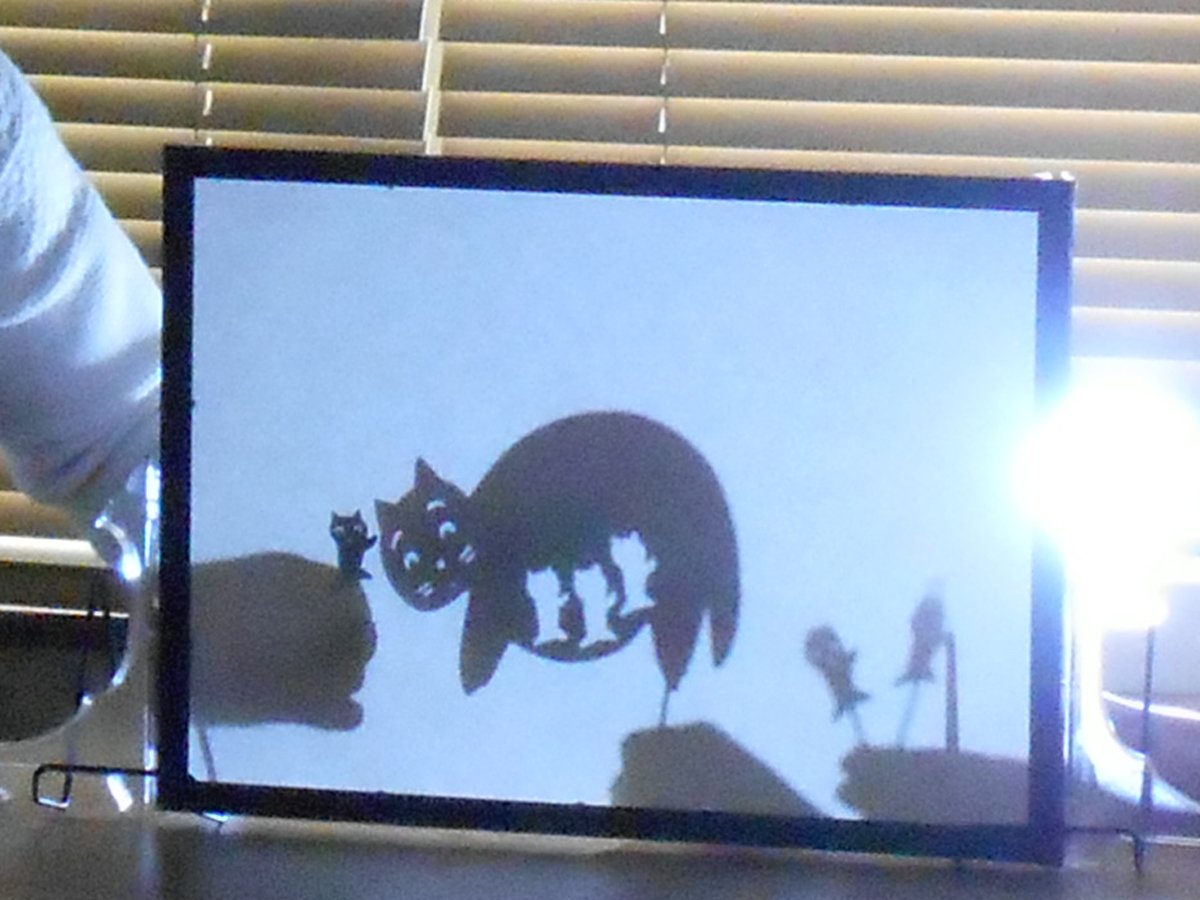 ネコの親子やいたずらネコのお話を読み聞かせしたり、絵本を元に作成した影絵を楽しみました。