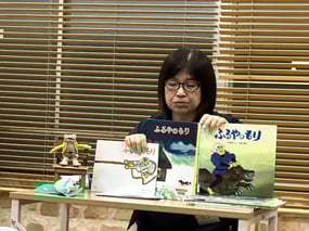 『あまつぶぽとり すぷらっしゅ』(童話館出版)その他の読み聞かせと共に、30冊以上の雨の絵本をご紹介しました。
